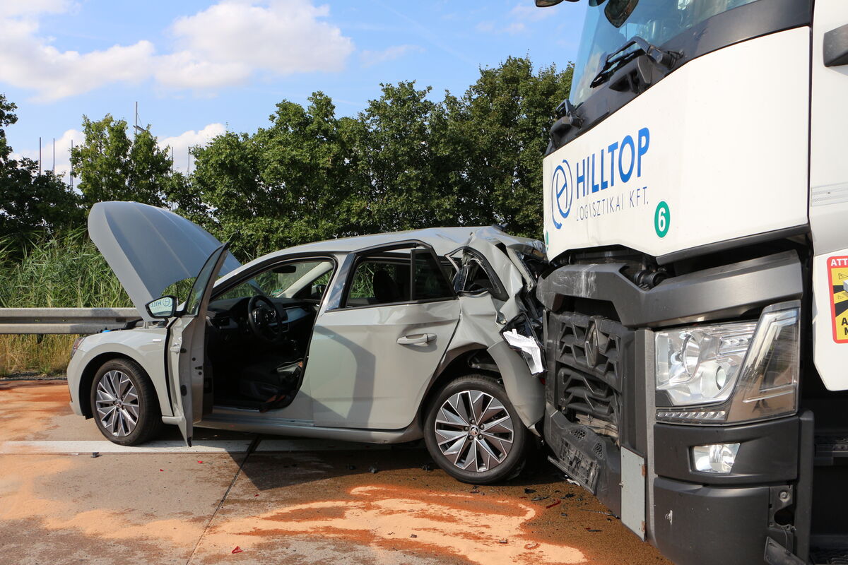 Ein Mann ist schwer verletzt worden, als ein Lastwagen auf der Autobahn 14 auf Höhe des Flughafens Leipzig/Halle auf sein Auto aufgefahren ist. Die Ursache des Unfalls am Montagnachmittag ist bisher unklar, wie die Polizei am Dienstag mitteilte. Der 47 Jahre alte Autofahrer kam in ein Krankenhaus. Die rechte und mittlere Spur der A14 Richtung Magdeburg waren zur Unfallaufnahme und Bergung gesperrt. Es gab Stau. Beide Fahrzeuge waren nicht mehr fahrtbereit. Die Polizei ermittelt gegen den 56-jährigen Lastwagenfahrer wegen fahrlässiger Körperverletzung. (dpa)