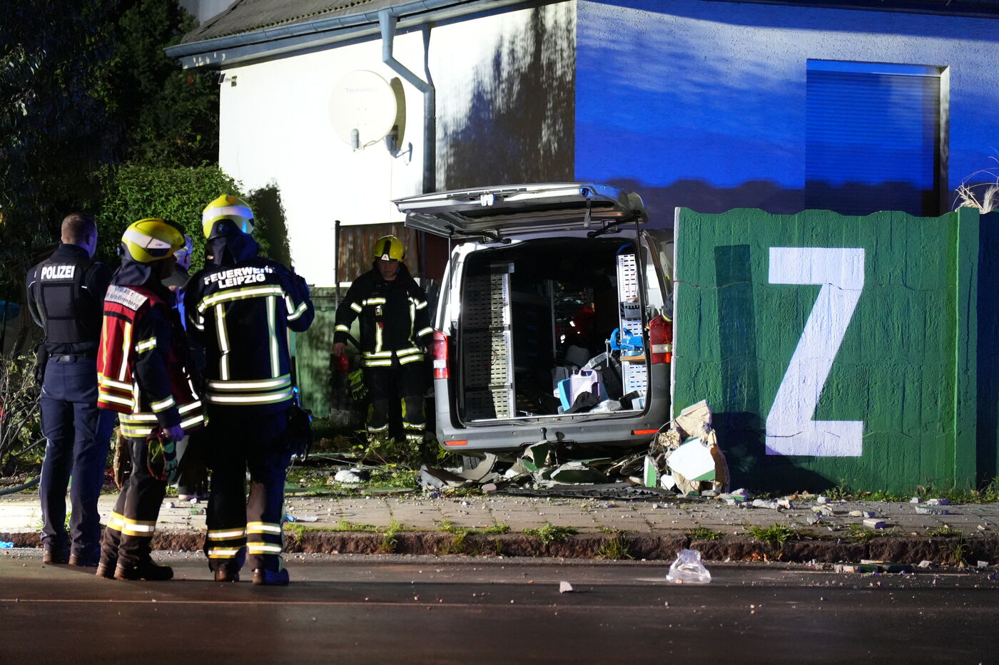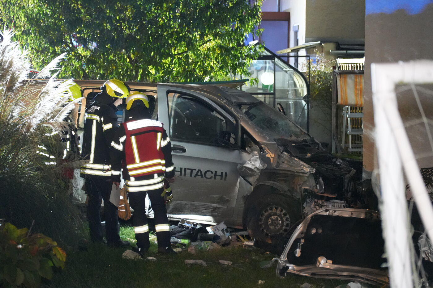 - Der schwer beschädigte Kleinstransporter nach dem Unfall an der Hauswand.