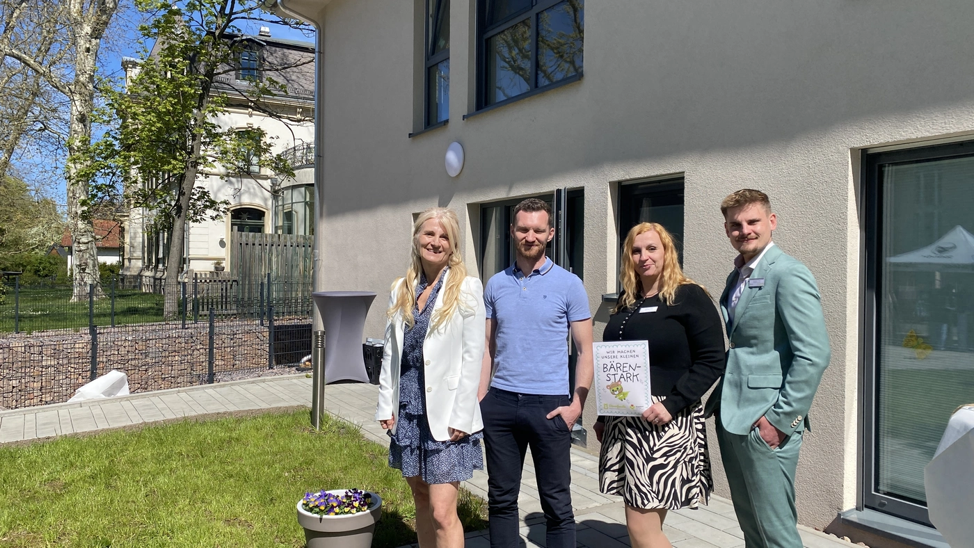 - Der Pflegedienst Nicole Tobias samt seiner Bärenfamilie in Leipzig vor der neuen Einrichtung.
